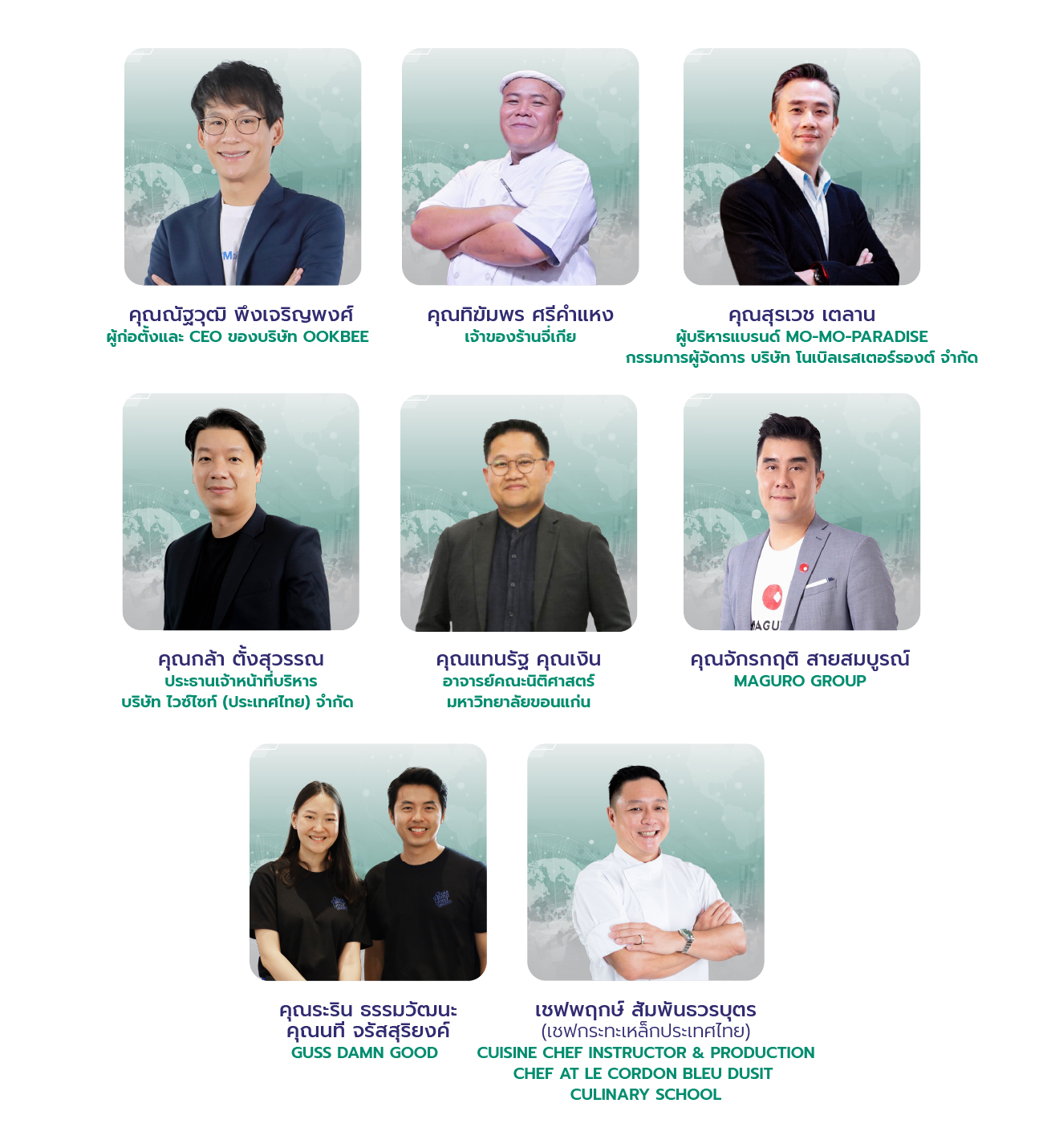 Speakers ของเราไม่ใช่การบรรยายจากนักวิชาการทั่วไป แต่เป็นการรวบรวมเหล่าวิทยากรผู้ทรงคุณวุฒิ และนักบริหารด้านธุรกิจอาหารและเครื่องดื่มตัวจริง มาร่วมแบ่งปันความรู้ ประสบการณ์ และแรงบันดาลใจ แบบหาฟังที่ไหนไม่ได้